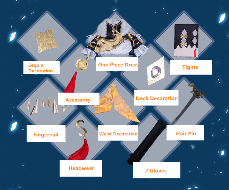 Costume = One Piece Dress + Tights + 2 Gloves + Headwear + Waist Decoration + Hair Pin + Fingernail + Neck Decoration + Sequin Decoration + Accessory