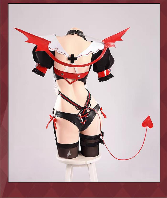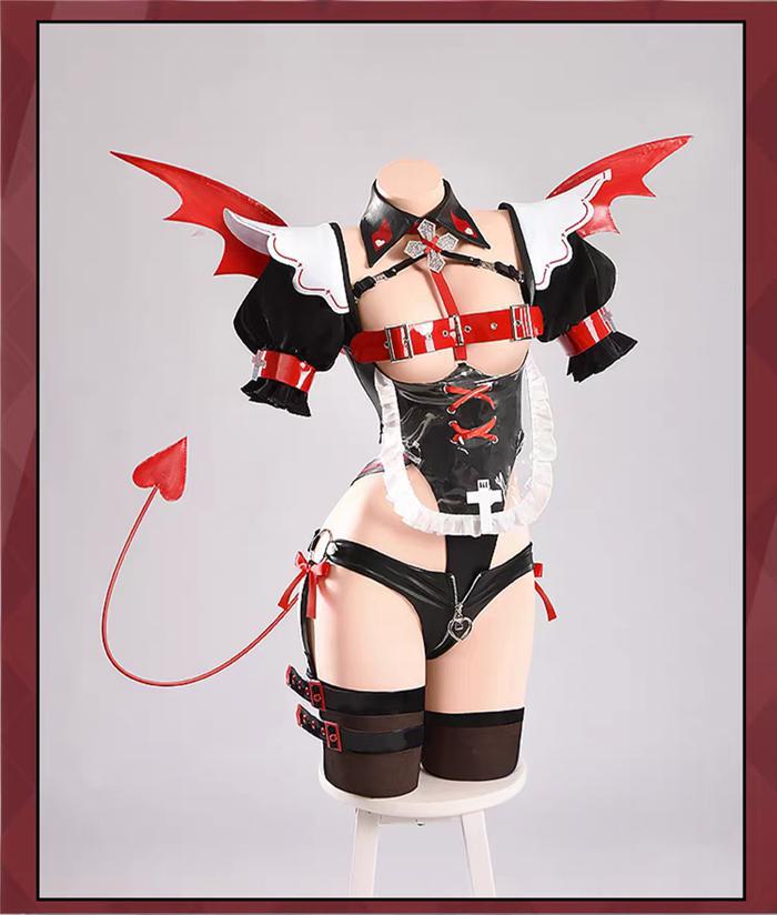 Costume = Jumpsuit + Panties + 2 Horns + 2 Hairclips + Headwear + A White Hairclip + A Black Hairclip + 2 Elf Ears + 2 Circle-shaped Earrings + 2 Cross Earrings + Collar + A Cross Pin + 2 Armlets + 2 Leg Rings + A Left Bracelet + A Right Glove + A Back Cross Pin + Wing + Tail + 2 Transparent Shoulder Straps + 2 Stockings