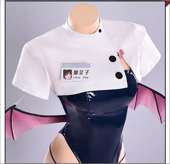 Costume Including: White Topwear + Jumpsuits + Nurse Hat + 2 Wristcuffs + Leg Ring + Gauze Bandage + 2 Hairclips + Nameplate + A Capsule Clip + Wing Tail + 2 Transparent Shoulder Straps + 2 Stockings