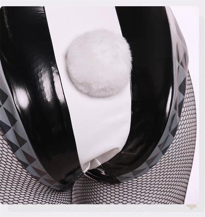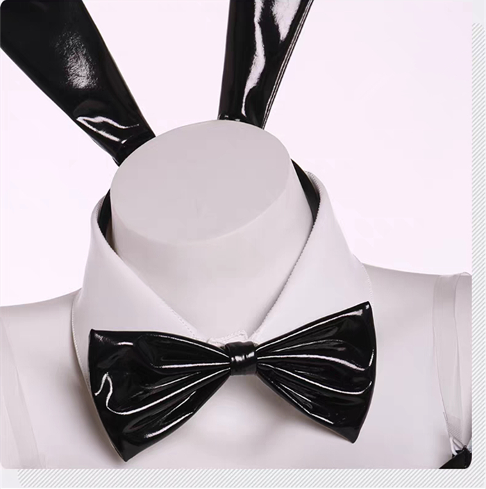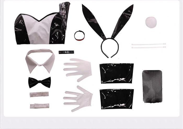 More Details of the CostumeCostume = Jumpsuit + Detachable Collar + Neck Bow + Rabbit Ear Headwear + 2 Hair Bands + Badge + 2 Bracelets + 2 Gloves + 2 Transparent Shoulder Straps + Bunny Tail + Mesh Tights + PU Stockings